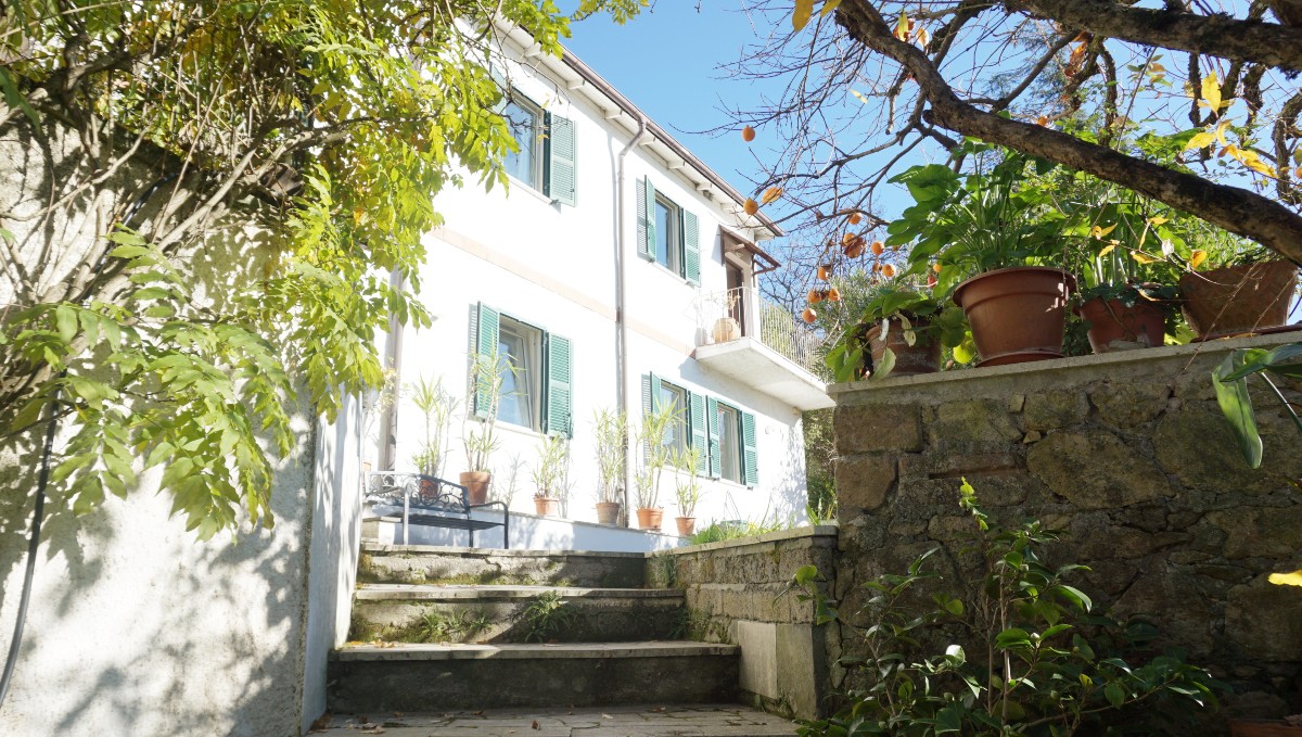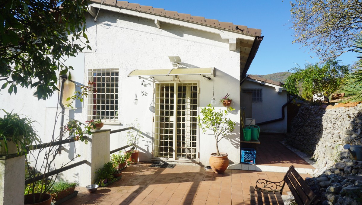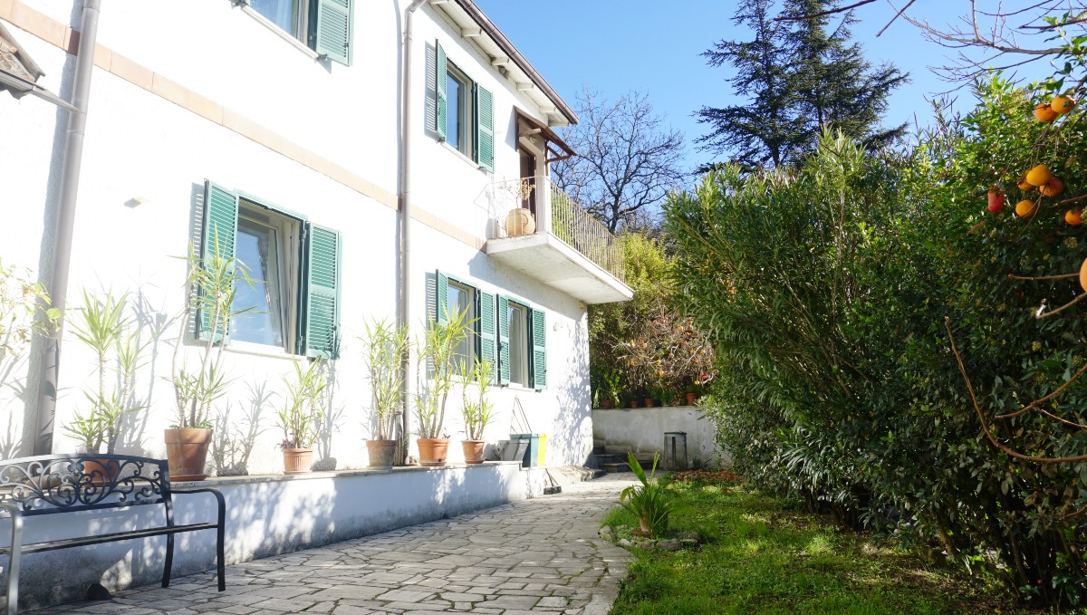 Una scala esterna conduce al primo piano: 1 ampio soggiorno, 1 cucina con accesso al giardino, 2 camere da letto, 1 studio e 2 bagni.