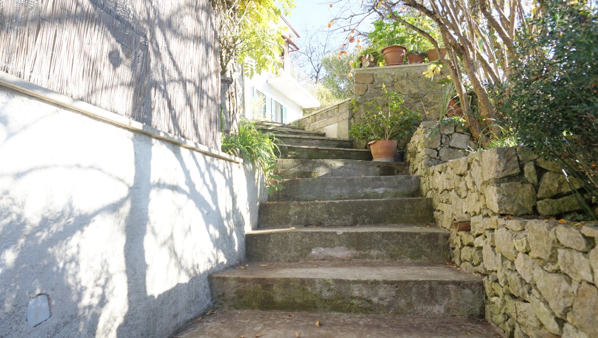 La proprietà dispone di un ingresso con gradini che conducono al cortile esterno, a circa 5 m sopra il livello stradale.