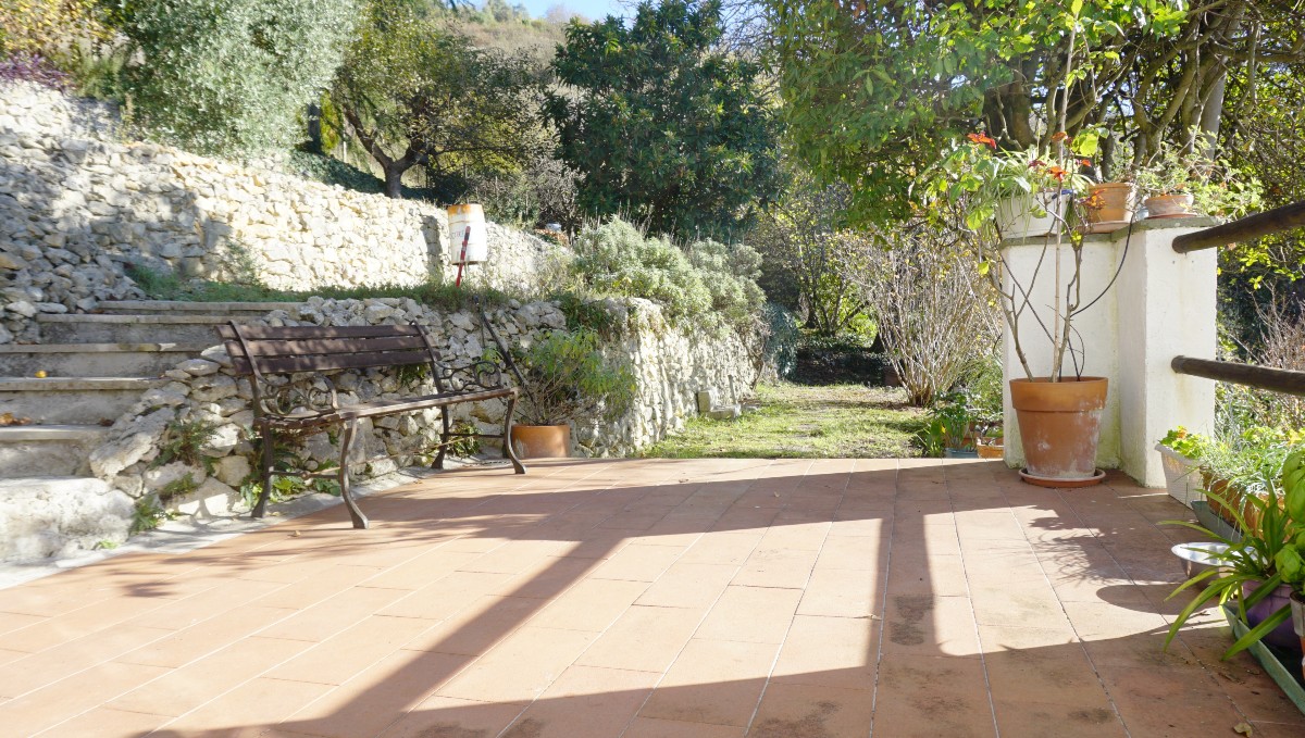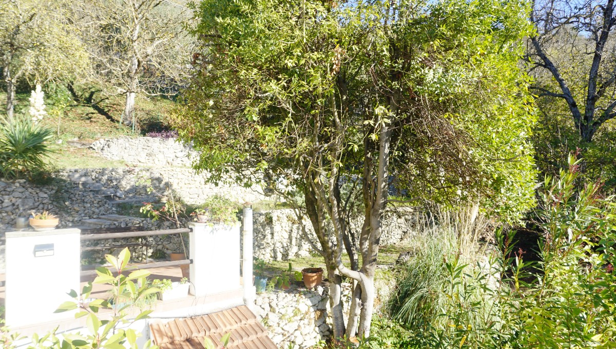 Nell’ampio spazio esterno sul retro si trovano una terrazza e pittoreschi muretti in pietra con aiuole per il giardinaggio, alberi da frutto e ulivi e una casetta in legno per gli attrezzi da giardino.